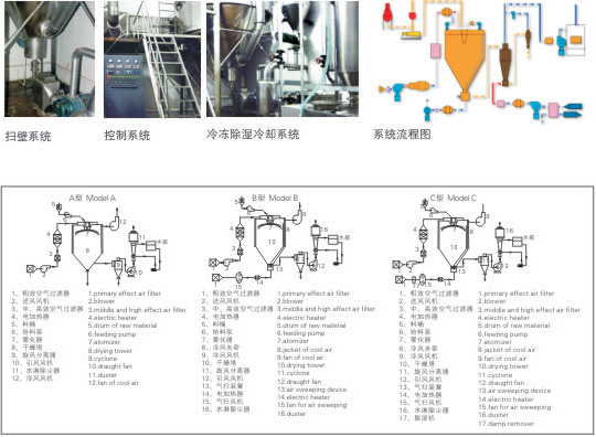 該機采用全封閉形式,所有部件均采用不銹鋼制造,配有三級凈化裝置,過濾后的空氣達十萬級要求 。簡體與頂部裝有冷壁裝置,使壁溫<80℃,物料在壁上停留也不焦化變質現象,大大增加了收粉率(達95%以上),而且不會產生混藥現象和粘壁現象。