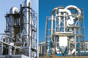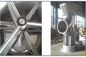 底部強化器設計獨特,攪拌齒為菱形,其流線性能使風阻達到低,設置在圓錐形料斗內,分動刀和定刀,粉碎效果顯著,使下落的結塊物料迅速粉碎為適合氣流干燥的粉粒料,攪拌的另一個主要作用是分散物料,加大了與料斗下面進來的高速熱風的接觸面積,于是料斗區形成了一個強烈傳熱傳質的流化床,大部分濕分在料斗區燥。隨著干燥的進行,變輕變細的干料受氣流作用明顯,與氣流一起上升并進一步干燥,然后從干燥塔頂部出來進入物料收集系統。